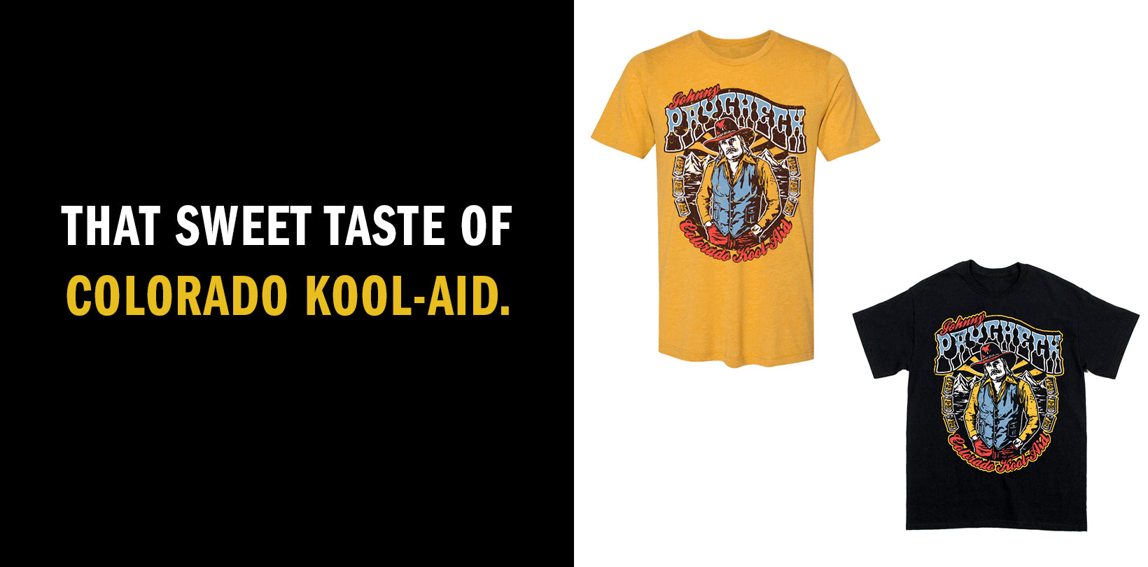 "It'll set you head on fire an' make your kidneys scream...." That sweet taste of Colorado Kool-Aid! This Johnny Paycheck T-shirt features an aged style front graphic in an overall..."It'll set you head on fire an' make your kidneys scream...." That sweet taste of Colorado Kool-Aid! This Johnny Paycheck T-shirt features an aged style front graphic in an overall...