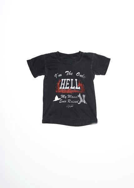 "She told me not to smoke it...But I did and it took me far away..And I turned out to be the only hell my mama ever raised!". It's time to raise hell in our Johnny Paycheck kid's tee!