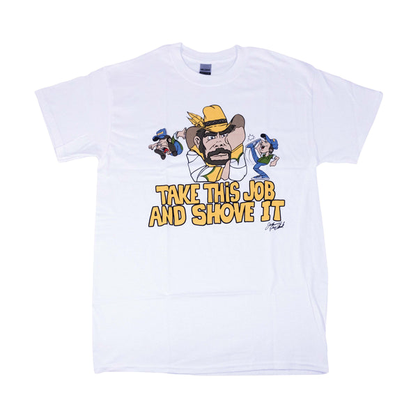 We've all been there. Now you can Take This Job and Shove it with our Johnny Paycheck tee-shirt! Walk out the door in style with this unisex style that has a real deal vintage vibe with a distressed front graphic that needs no explanation!